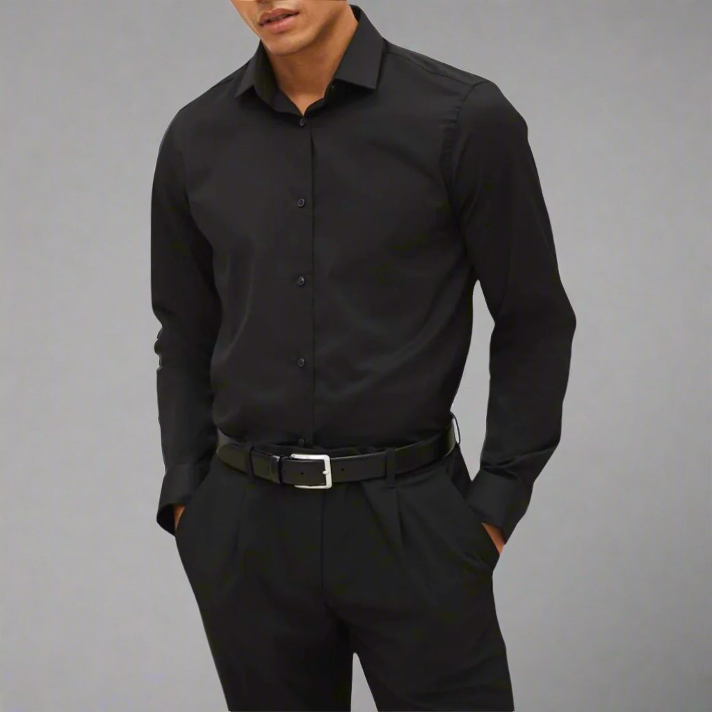 This classic slim-fit cotton shirt made from soft, breathable cotton in timeless black, it’s ideal for both formal and casual occasions. Pair it effortlessly with jeans or dress trousers for a sleek, versatile look.